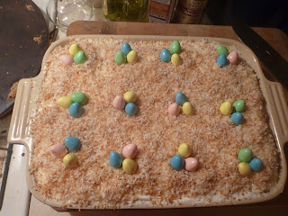 Happy Easter!!! For Easter, I made a coconut cake, which is my favorite on Easter. It’s an Angel Food Cake, topped with pina colada mix, whipped cream, and toasted coconut. And, for the extra Easter-ness, I added some candy eggs to the top, like little nests. Probably would have been cuter in cupcakes, but it’s definitely tasty this way!