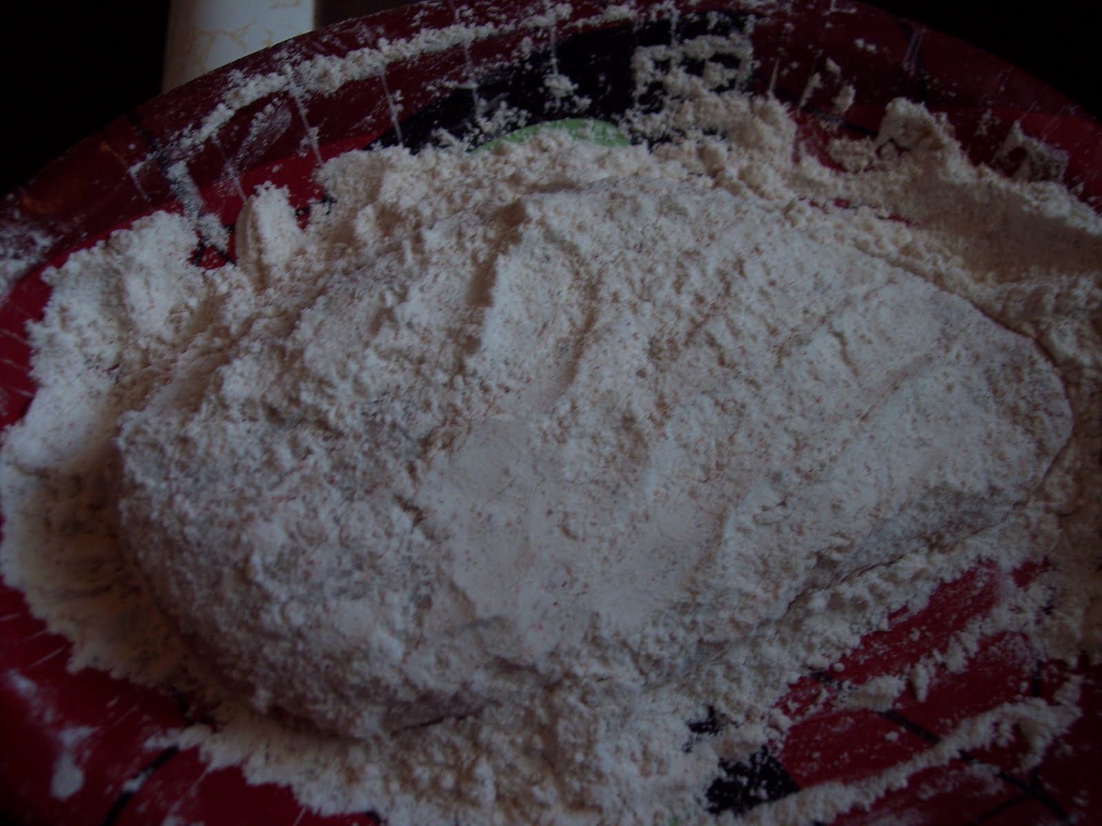 Check that the oil in the pan is ready (when you throw a little flour in the oil it should sizzle) but not too hot (sputtering and splattering with nothing in it, or smoking, burning, etc).  Place chicken in the pan, repeat.