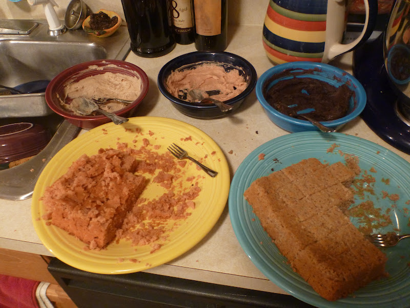 To prepare for the upcoming Let Them Eat Cake event, I held a preliminary cake tasting at my house with 2 different recipes of cake and 3 different recipes of frostings. I actually was very surprised at the turn out; several of Chris’ friends seemed to really enjoy the tasting! Several took a scientific approach, trying each frosting with each cake and noting their impressions. Here’s what the scene looked like: