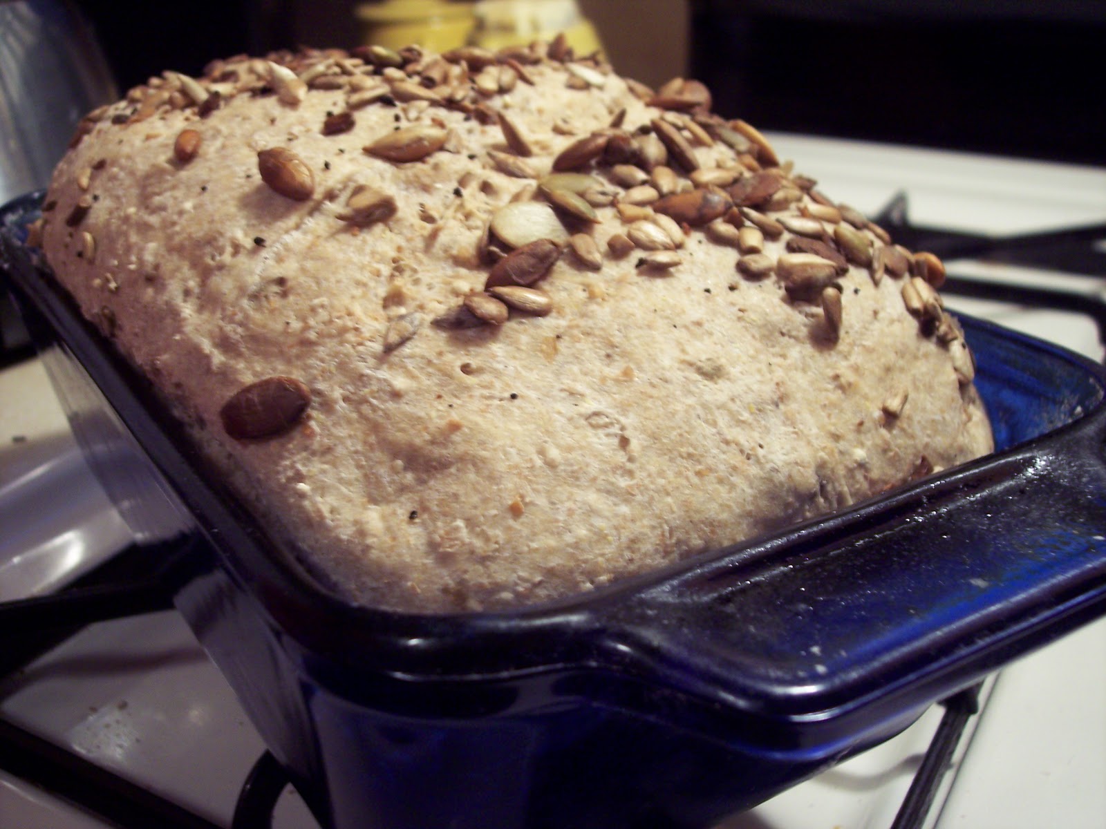 Preheat oven to 350 degrees F, unwrap the Saran from the bread, and brush the top of the bread with egg whites. Sprinkle the remaining seeds over the top of the loaf. Bake for 40 – 50 minutes & cool it for 15 minutes before turning it out. Cool another 2 hours before eating…and finally, crack into the yummiest sprouted grain bread you’ve ever had!! Whew!