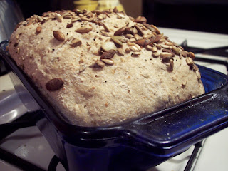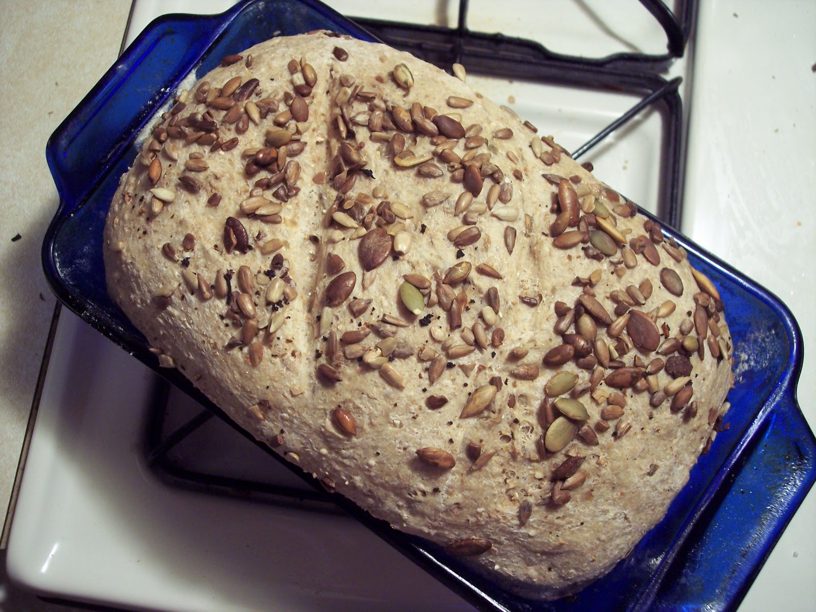 Toast the Sunflower, Pumpkin, and Sesame seeds until golden brown. Meanwhile, combine the sprouted grain paste from the Sprouted Grain step, flour, yeast, and salt in a stand mixer with a dough hook (or by hand, if you’re awesome/crazy). In a liquid measuring cup, measure warm water, and add honey to the warmed water; whisk. Slowly, pour honey water into the flour mixture; mix on low for 2 minutes, or until sticky and combined. Turn off the mixer & cover the bowl with Saran for 20 minutes.