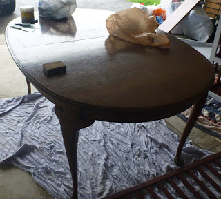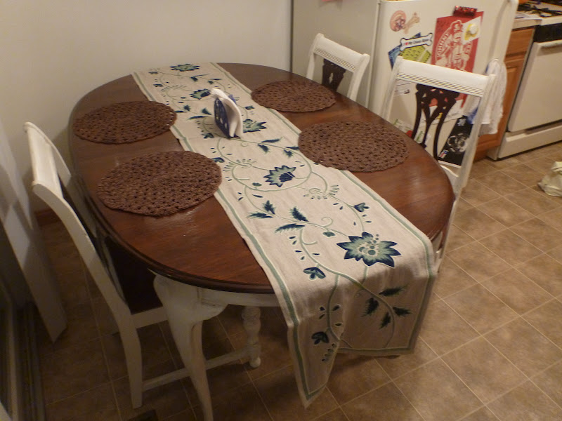 Thus begun our search for the perfect table. Keeping in mind that we don’t have $5000 to spend on a fabulous new stylish table and stunning set of chairs, we looked at garage sales, craisglist, etc…and for $50 at the Goodwill, tucked behind some true hideousness, we found this: