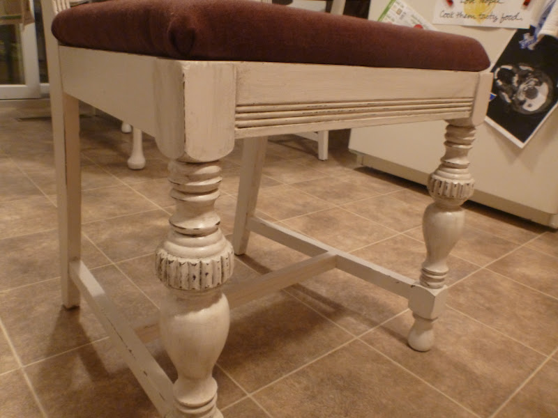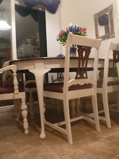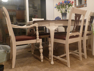 We wanted the table and chairs to complement each other at the end of the project, so we painted the chairs with the same white with the antiquing finish, while giving a refreshing walnut stain to the back, and the end result very much complements the table: