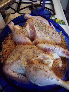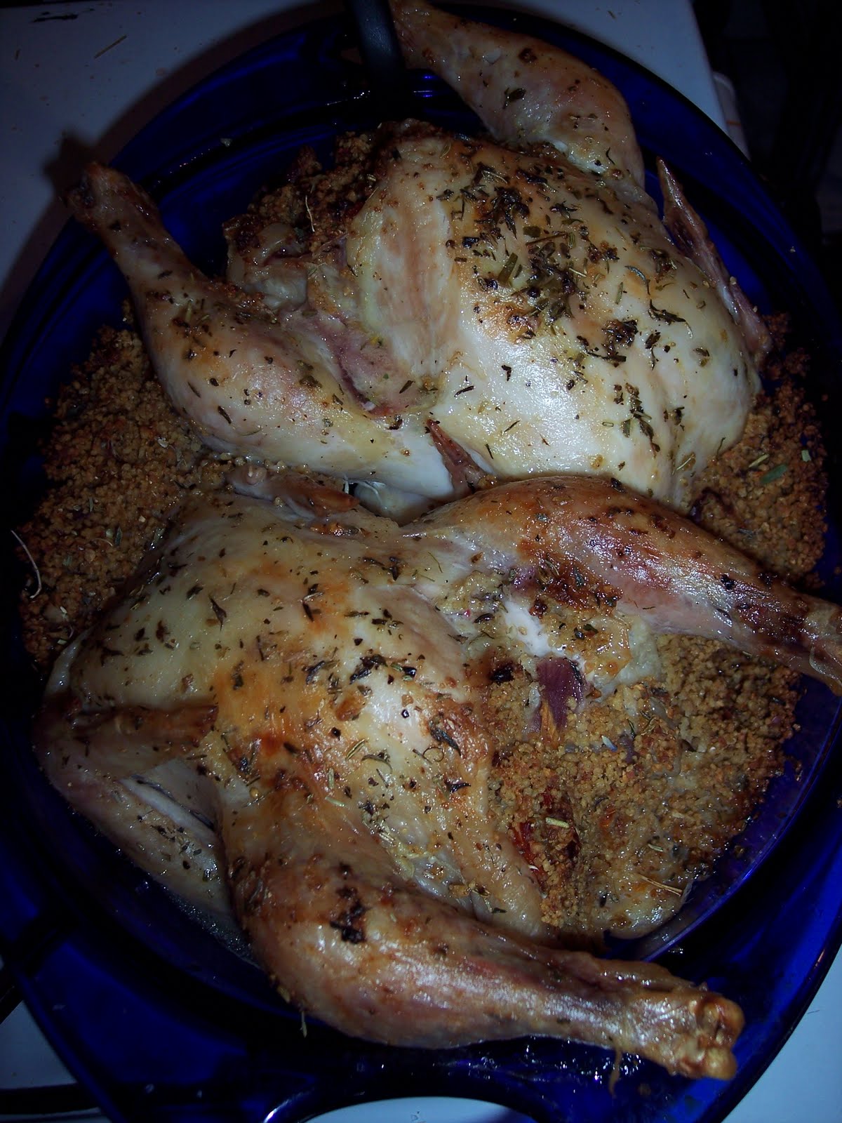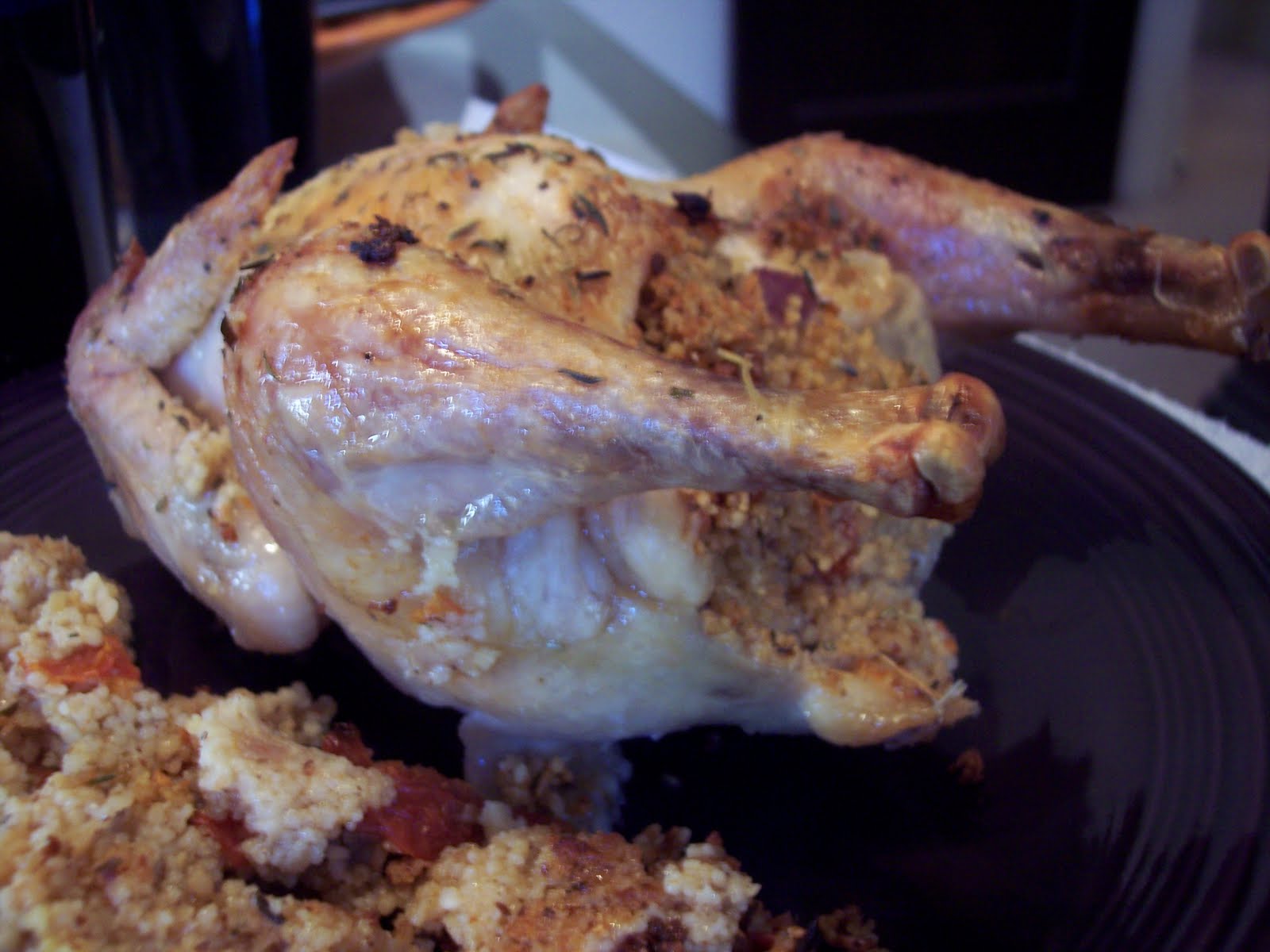 Preheat oven to 375 degrees. Make sure that the cornish game hens are thoroughly “cleaned out” on the inside. You can spoon the couscous stuffing straight into the birds, like a Thanksgiving turkey. (Any excess couscous can just surround the hens, it will get a little crispy on top.) Brush the melted butter over the top of the birds, and sprinkle on the herbs de provence, salt, and pepper. Mine looked like this: