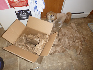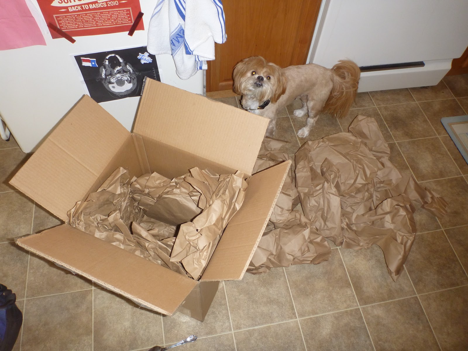 I got a very early birthday present today!! First, the box (and my bff Buddy who helped me):