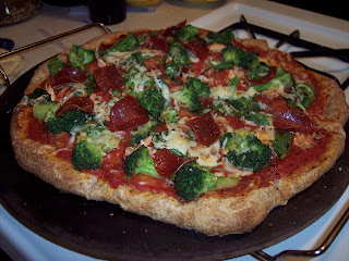 Spray/brush a little olive oil around the edges of the crust, so it will brown nicely.  Sprinkle the garlic throughout the middle, where the toppings will go.  Pour the tomatoes on top of the garlic, and spread with the back of a spoon evenly across the dough.  Season the tomatoes now with salt, pepper, and basil.  Sprinkle chicken on top of the tomatoes; distribute the spinach leaves all over the tomatoes (it should look full- don’t worry, spinach shrinks quite impressively with heat).  Sprinkle the broccoli over the spinach leaves and spray/brush the broccoli with a tiny amount of olive oil and sprinkle garlic powder, basil, salt, and pepper over the whole pizza.  Sprinkle the cheeses evenly; place the pepperonis evenly on top of the cheese.  Season with basil, garlic powder, salt, & pepper.  Bake pizza at 450 degrees F for 10-15 minutes.  Pizza is done when crust is slightly darker than golden brown, and the cheese is melted and bubbly, and the veggies are slightly browned.  Cut into 8 slices, enjoy!!