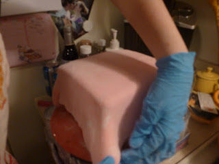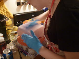 It wasn’t an easy task for the bottom bigger layer, because I kept rolling the fondant too thin, and then it would rip! Then I had to start over and re-roll…ugh. Eventually, I got the cake covered, and assembled for a trial of how it would look at the competition: