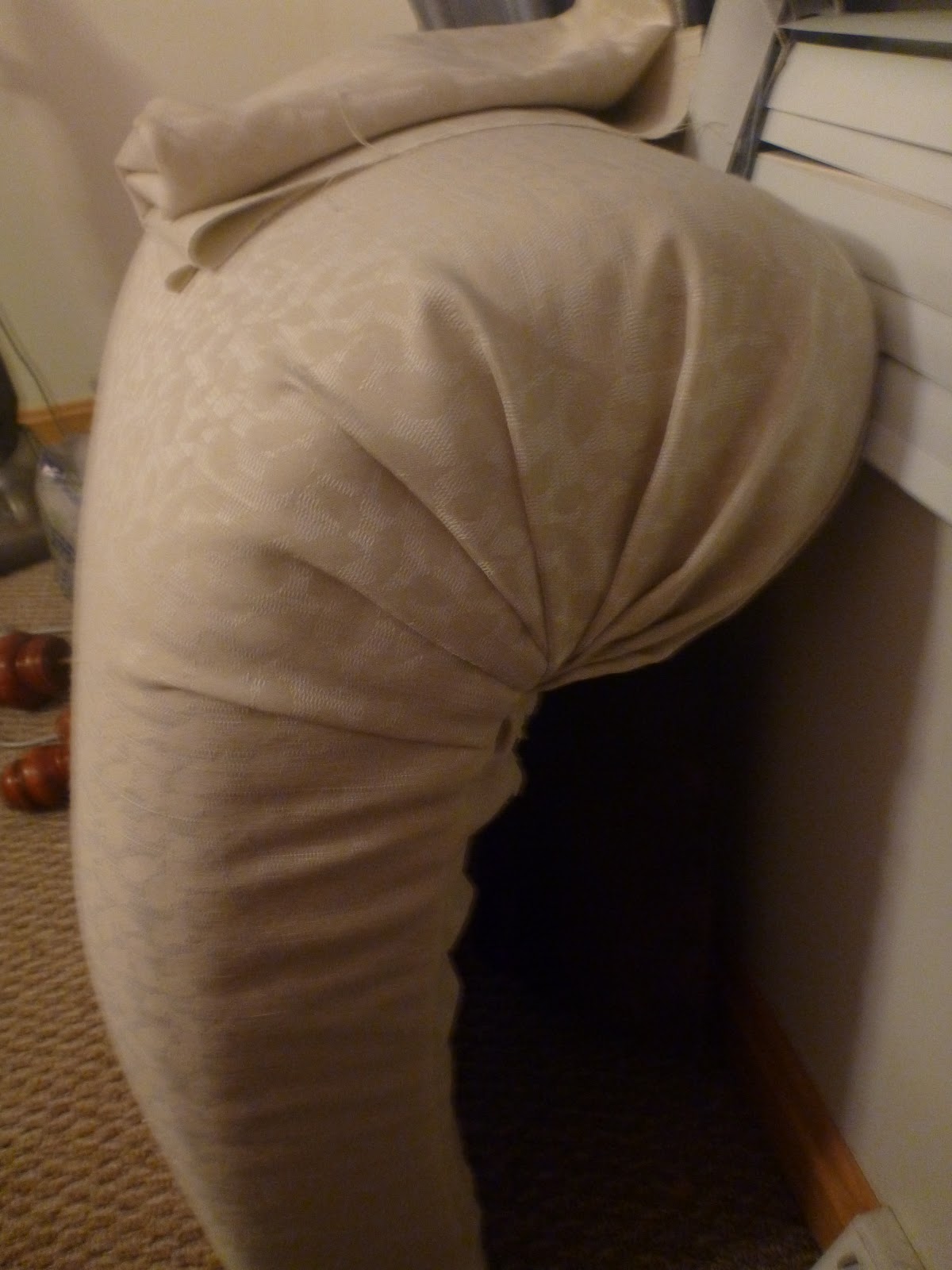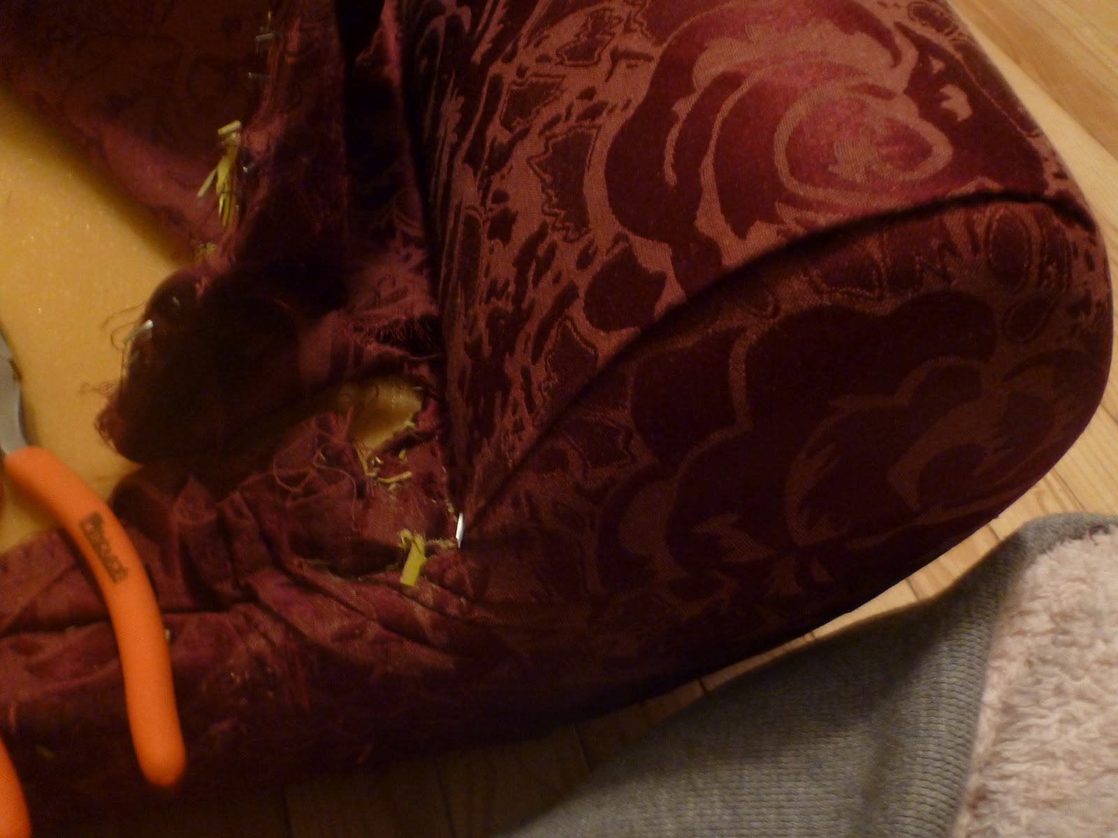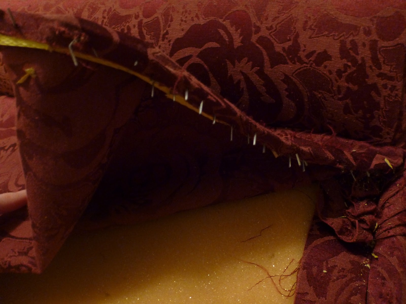 And here is the covering process. What isn’t pictured is the placement of the foam padding and wrapping of all of the padding in batting.