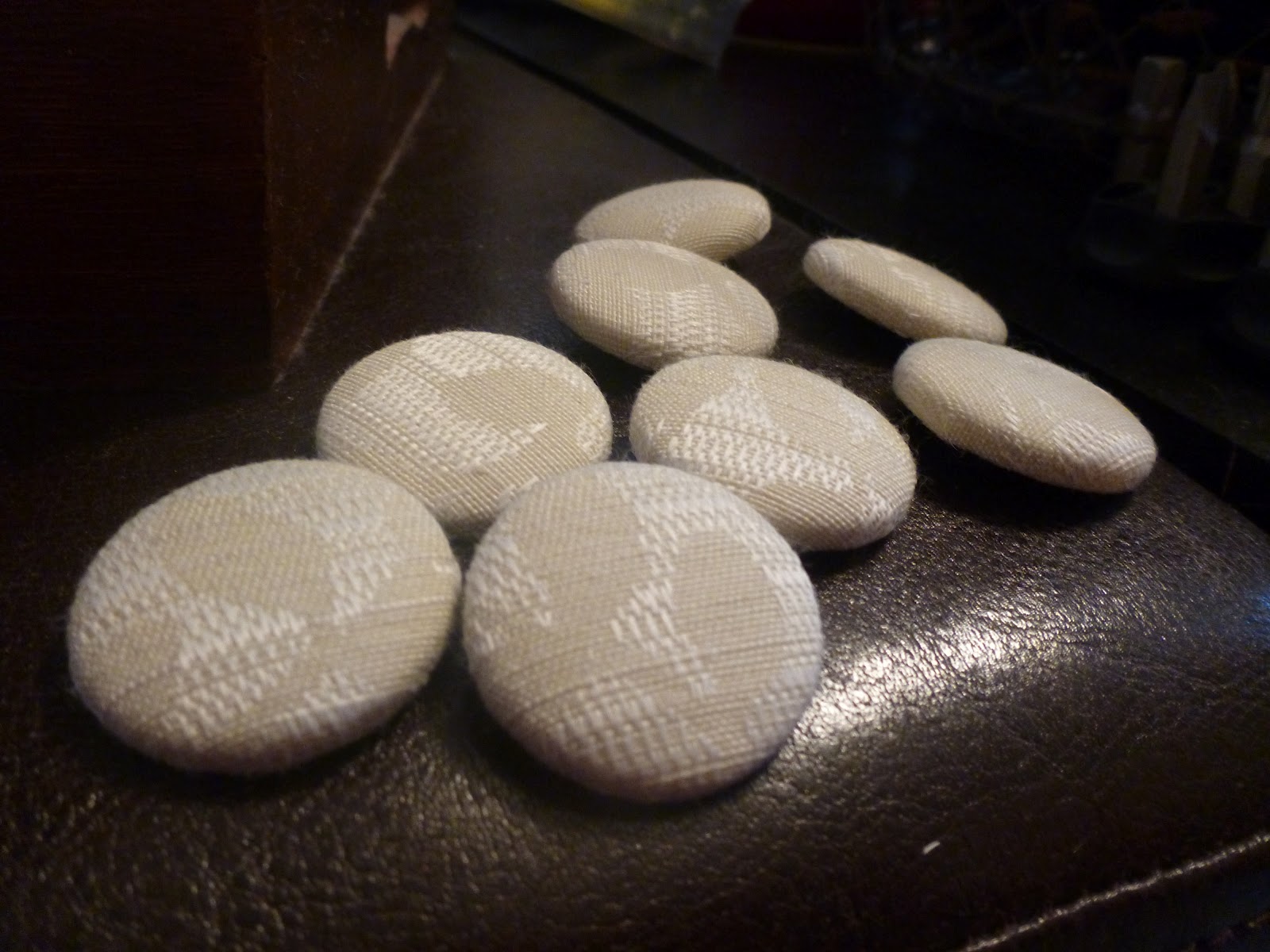 While the paint dried, I made the buttons. 17 in all. I had mistakenly bought two different sizes of button kits, but I made it work.