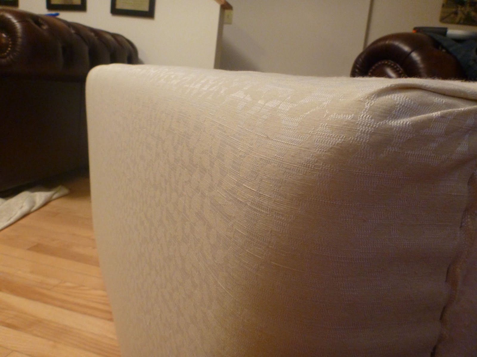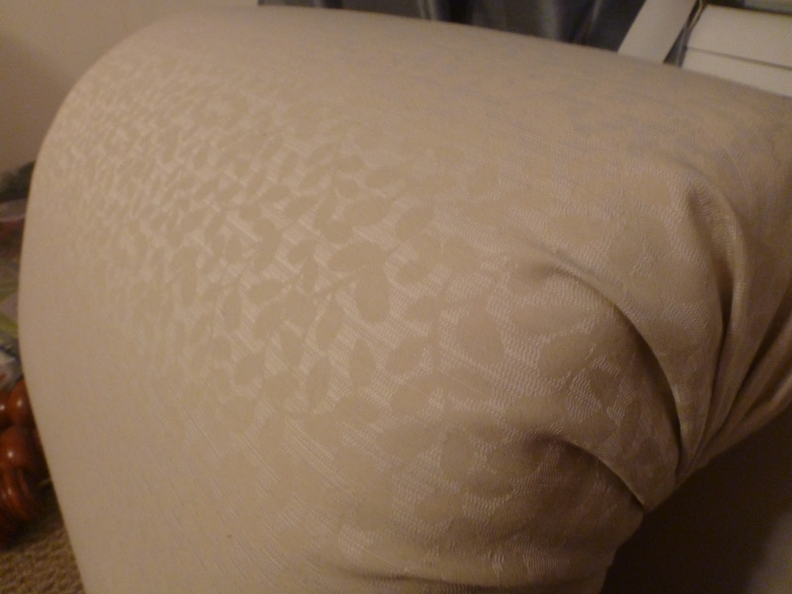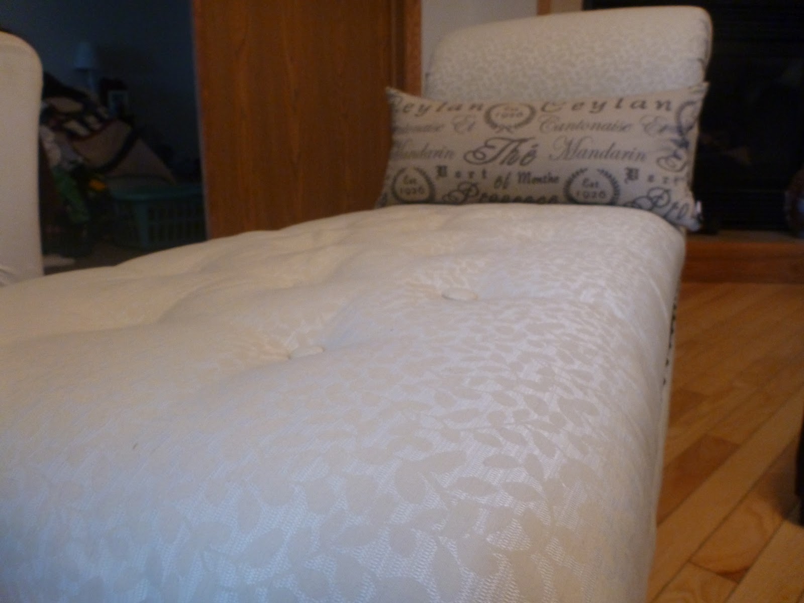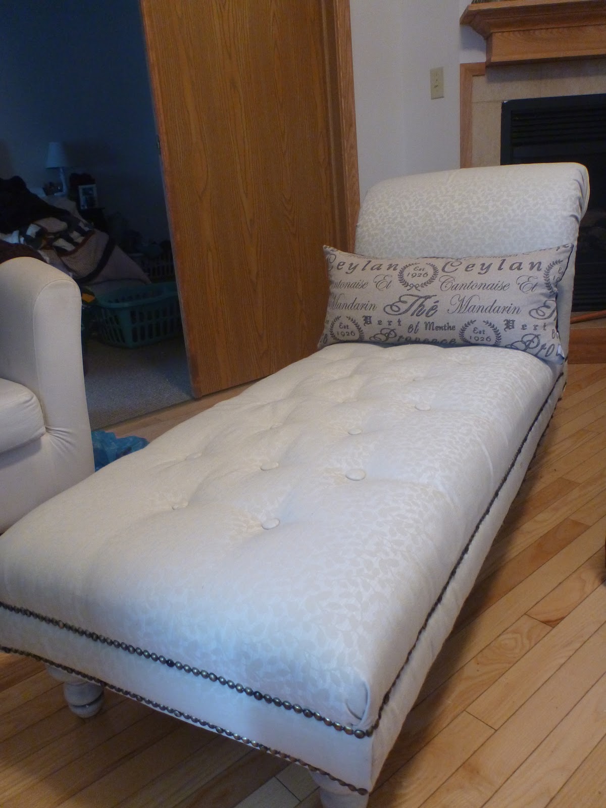 I painted the legs of the chaise. Now that the tassel had been removed, the legs were going to show, so I figured they had better look decent! I painted them white, and then antiqued them with antiquing glaze. Yes, it was snowy.