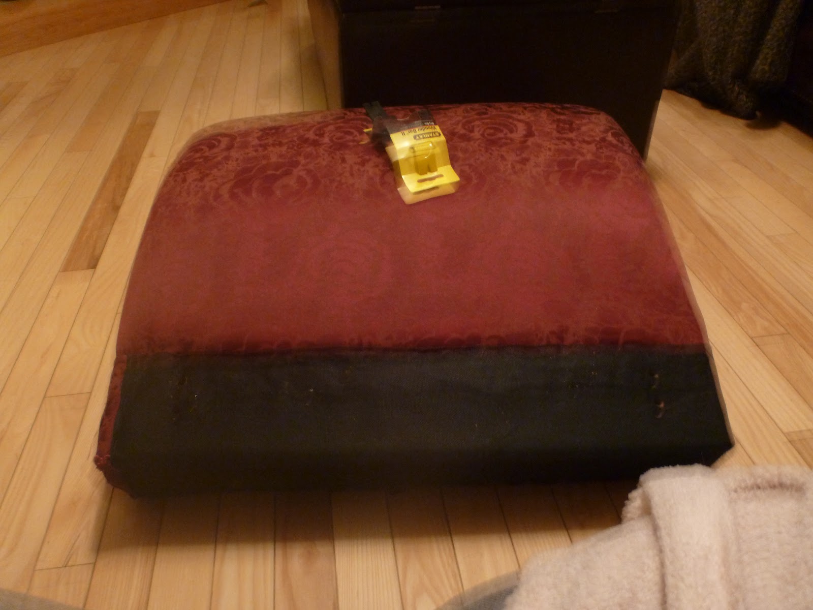 This is the seat portion of the project: the top is covered and stapled, the sides have been covered, stapled, and tacked at the seams.