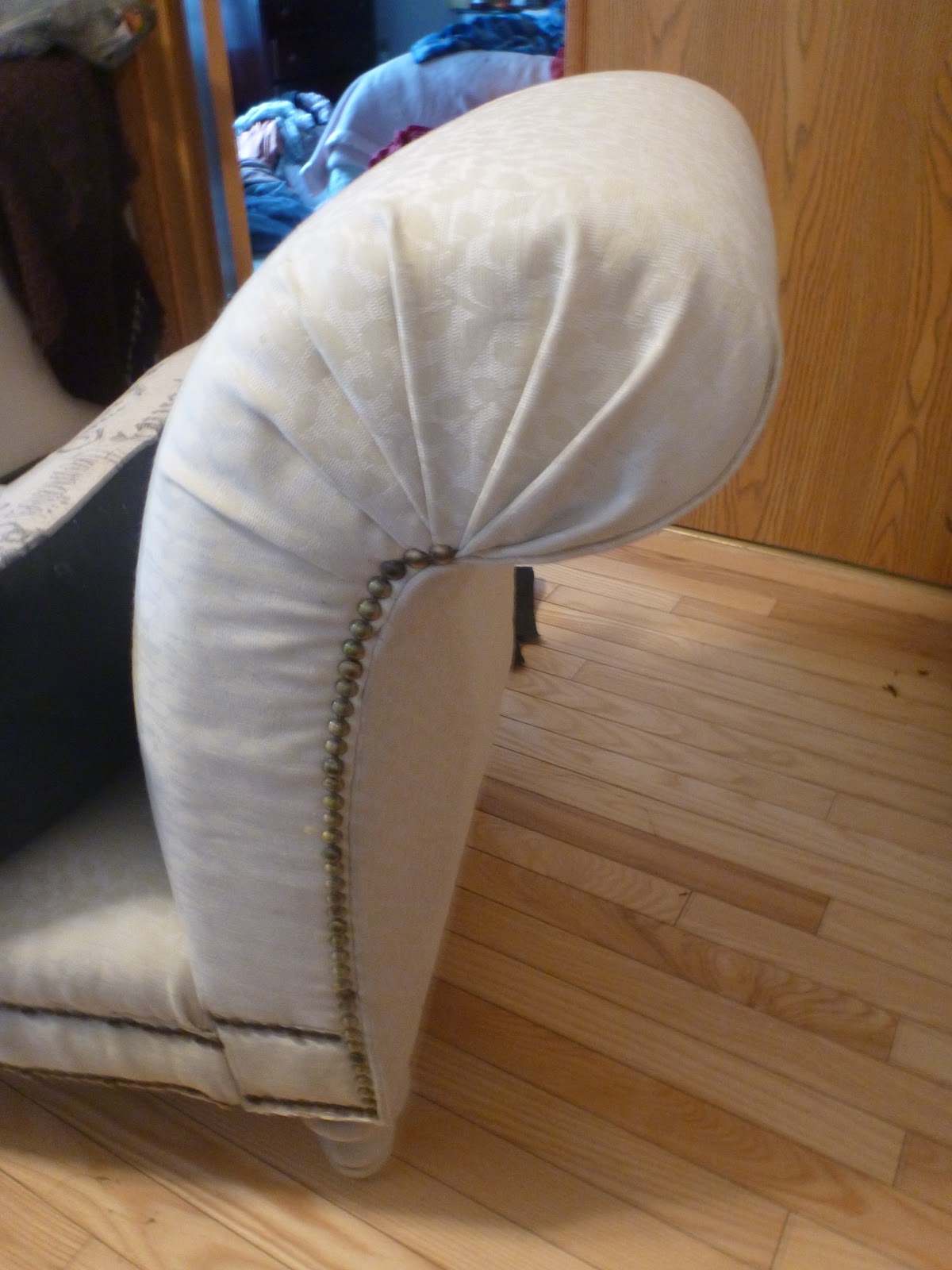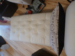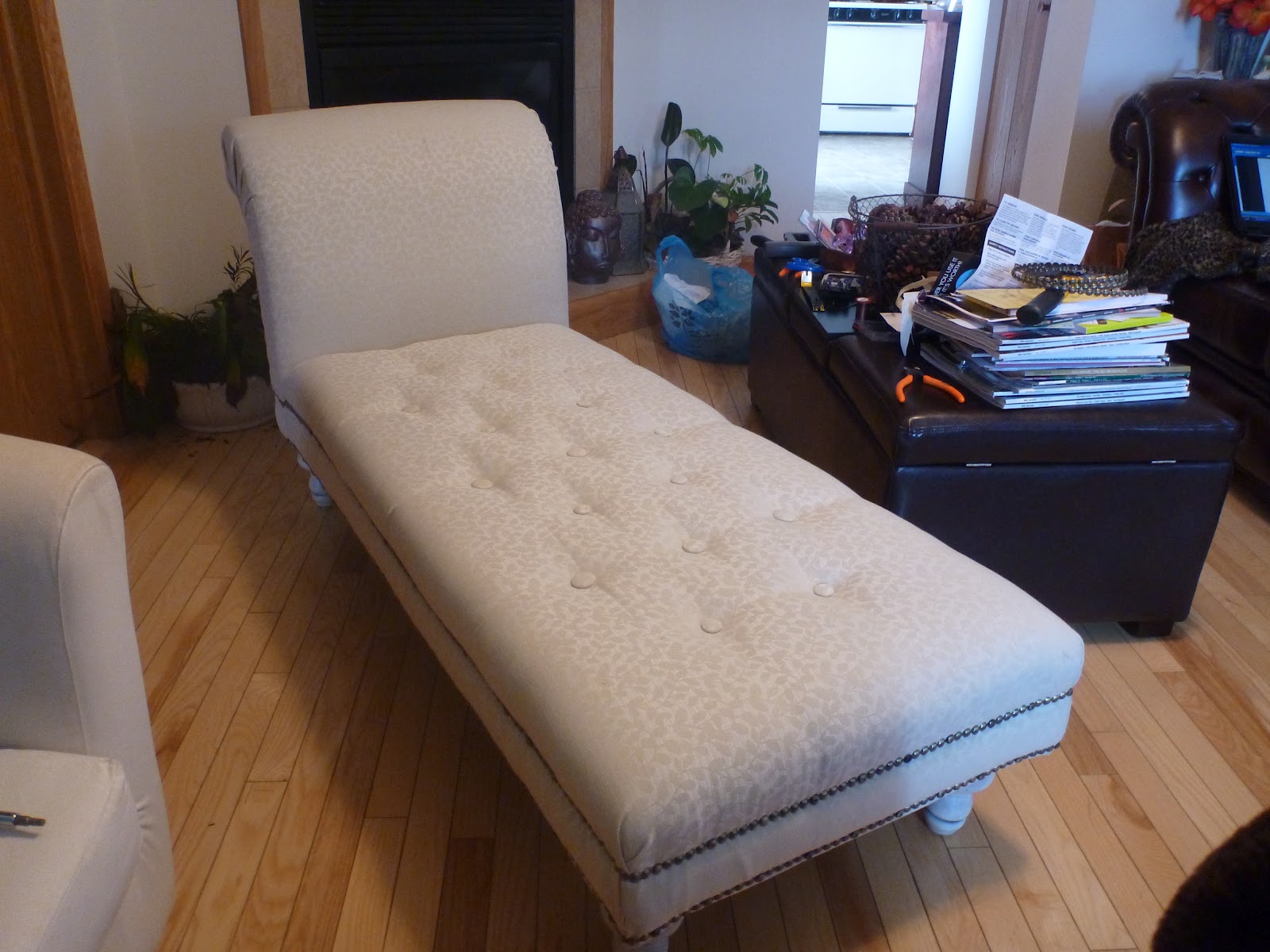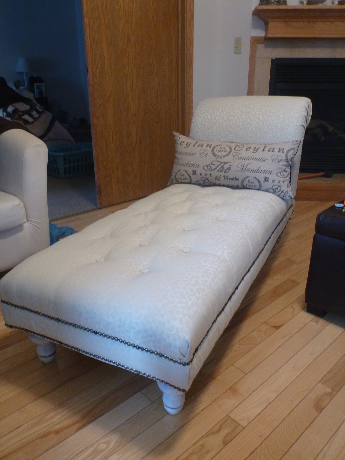 Between these 2 photos, lots of progress happened. I tufted the seat, and nailed nailhead trim around the edges. In the next picture, we were putting the chaise back together.