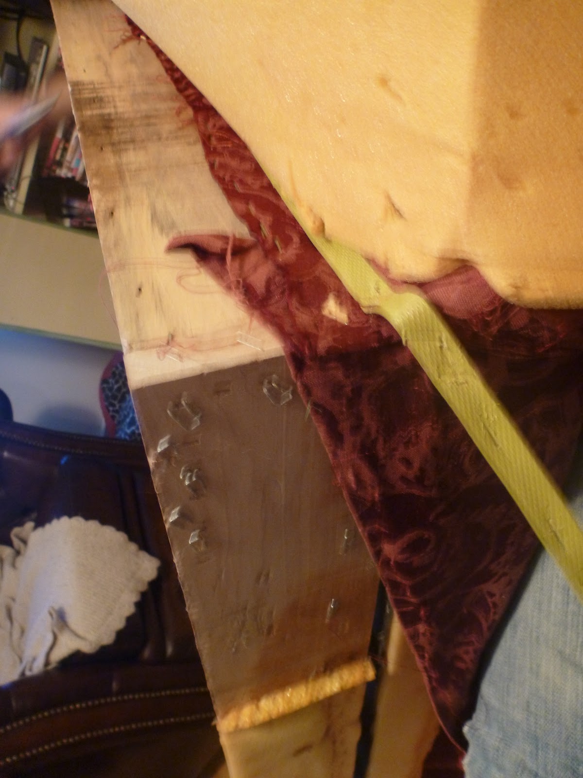 There were approximately 1 MILLION staples in this chaise lounge- popping every single one of them out took so much time- days and days and days on end of popping out staples. The wooden frame wasn’t made of the all the same wood, either, so some of the wood was very very hard- it was difficult to get the staples out of that wood. My hands hurt, my wrists hurt, my forarms hurt, and my back hurt.