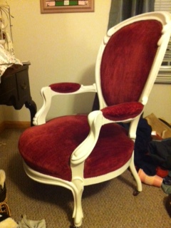 I don’t have a “before” picture of the chair, but it was stained wood, sort of an “orangey” tone to it. Obviously, that clashed with the red upholstery…it just made my eyes hurt. A little white paint later…