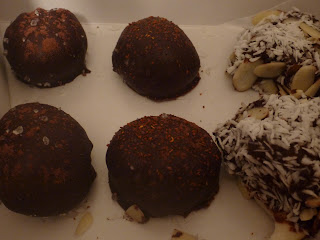 Handmade Truffles (left to right): Peanut butter with sea salt, Almond with crushed cayenne pepper, and ganache with chopped cherries rolled in coconut and slivered almonds: